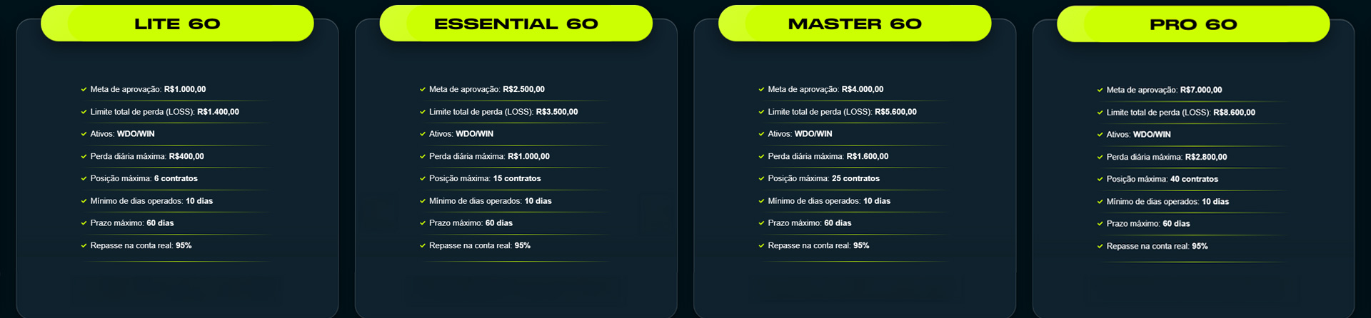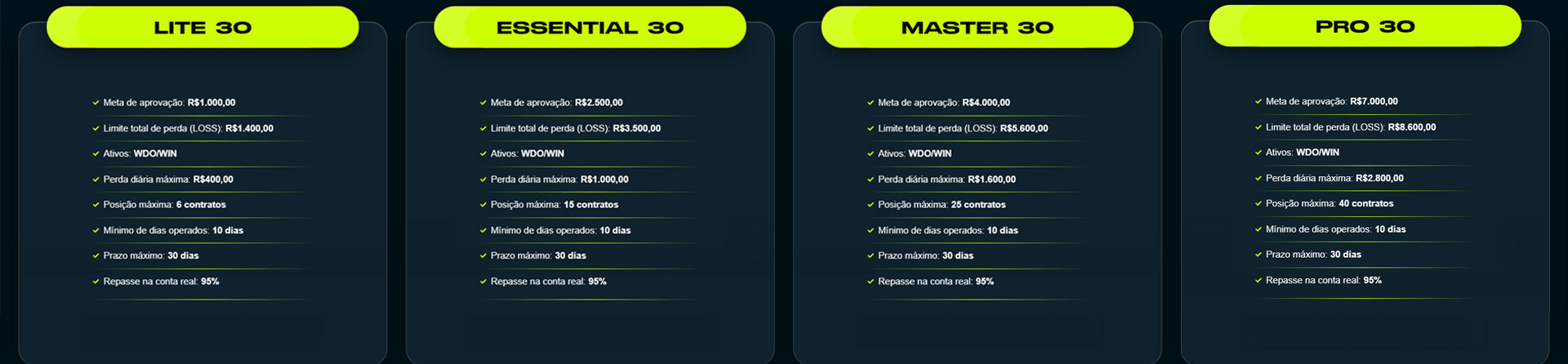 A Canario Mesa Proprietária disponibiliza diferentes planos de avaliação, cada um com parâmetros específicos, dias mínimos operados, prazo máximo, limites de perdas e ativos permitidos.